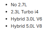 I could see the 2.7 going away/being replaced with a hybrid-only variant. .... I dug up the thread that had the survey, a TLDR version of powertrains were: However, there was apparently 12 pages of potential combos (he didn't specify the variants, and all photos were pulled down). I find it hard to believe that they wouldn't have an upgraded engine option for non-Raptor models, so I'd assume the 3.0hybrid would be the "2.7" upgrade option? Maybe with a HiPo 3.0H standard for Raptor, with a 5.0H optional?