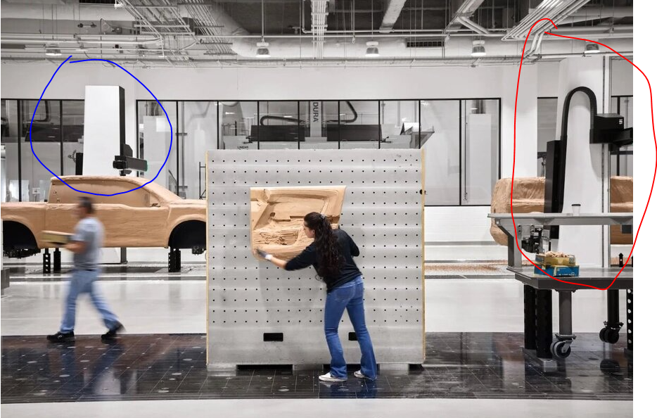 rmc523 Posted November 19, 2025 Share Posted November 19, 2025 18 hours ago, DeluxeStang said: Maybe this hints at the styling direction of the CE1 truck? The details aren't milled out yet but I don't recognize the overall shape. Plus it was shown by their head of design on his social media which feels more purposeful. This is actually the SUV in the right of the photo above, BUT, I wouldn't be surprised if they share the same front end..... Here's why I think this..... Notice in this photo, the clay cutter is behind the truck (blue), but in front of the SUV (red)? Looking at the front end view, you can see the single cutter on the right side (blue, which would be behind the truck in the other angle), and the single one on the left (red, in front of the SUV from the other angle). They also roughly align with the breaks in the windows on the right. 2 Quote Link to comment Share on other sites More sharing options...