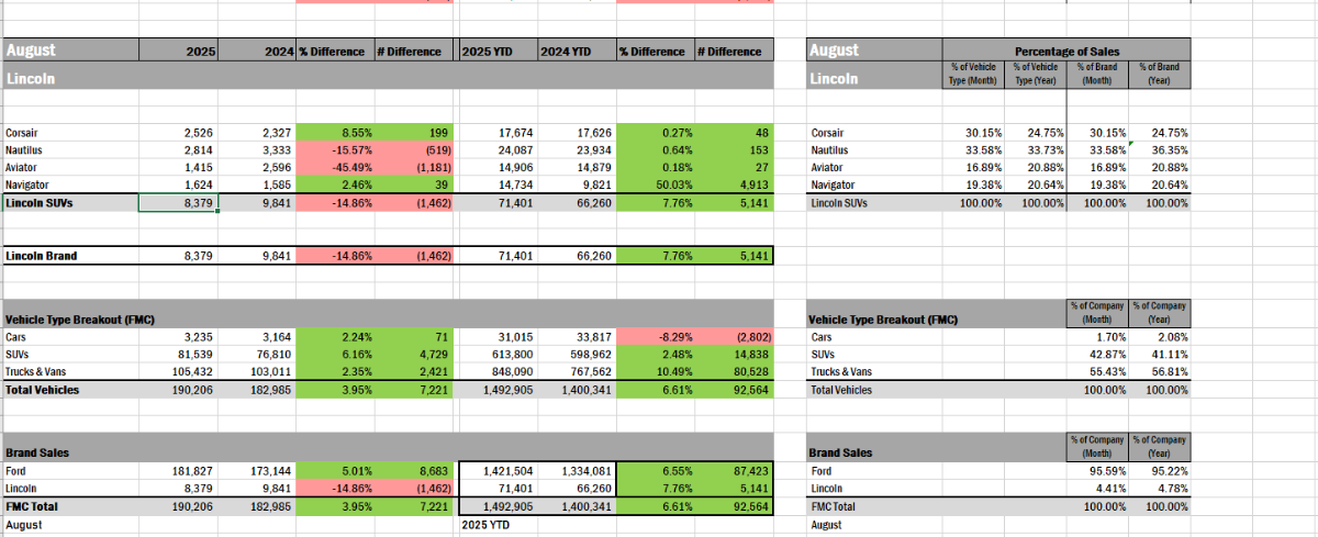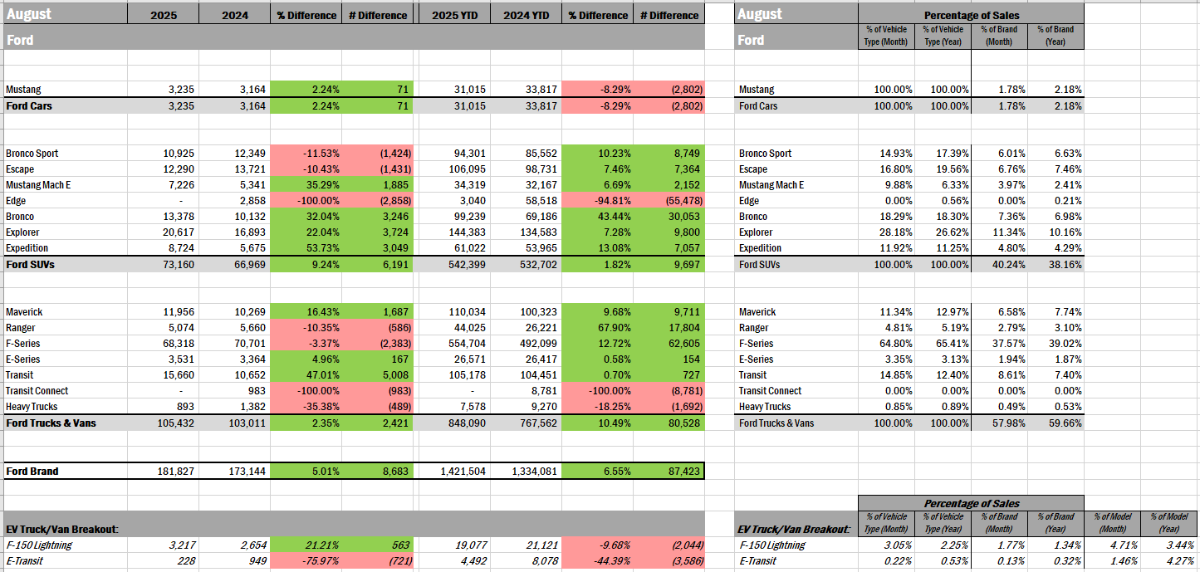 rmc523 Posted September 3, 2025 Share Posted September 3, 2025 Bronco, Explorer, and Expy are doing well. Mach E rebounded. I'm surprised to see Ranger down, given its low numbers already, but I'd guess they're still prioritizing Bronco over Ranger production. Lincoln had to compete against crazy numbers in August last year, but still up overall on the year. 2 Quote Link to comment Share on other sites More sharing options...
