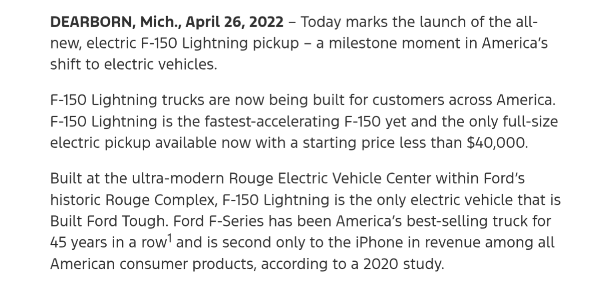 morgan20 Posted October 31 Share Posted October 31 (edited) On 10/28/2025 at 10:34 AM, T-dubz said: This is lazy ai slop In this case ai isn't "artificial intelligence", it's "real stupidity". On 10/28/2025 at 6:24 PM, sullynd said: I’ve got 52,000 miles on my 22 Lightning. I have two ICE I could drive instead (15 Edge and 23 Maverick) and we choose the Lightning every time*. It’s sooo much better for roadtrips that it is laughable when people assume otherwise. *The only time we didn’t is the one time we had to tow over 150 miles. Less than that and we tow with the Lightning. It’s a towing beast. Congrats my friend. I'm up to 64k miles on my '22 F-150 Lightning. Just got back from a fishin' and campin' trip near Terre Haute. The Lightning towed the boat and all the other gear with incredible ease. Like you said, it's a towing beast. On 10/29/2025 at 10:55 AM, akirby said: Two neighbors have them and could not be happier. It’s everything that’s great about F150 just with an EV powertrain. If they were able to sell them for $40k sales would probably double. Yea, I like what you said there, It’s everything that’s great about F150 just with an EV powertrain. To me, that makes it the best F-150 there is. I've owned seven F-150s in the past 30 years and the '22 Lightning is by far the most satisfying among all of 'em. And you're also right about If they were able to sell them for $40k sales would probably double. About $40k was the price of mine. Hopefully the big shots at Ford are able to apply the lessons they learned building F-150 Lightning for the past four years, advances in battery technology, and all the newfangled know how at the skunkworks to make F-150 Lightning at the $40k price point a reality again. Ford needs to obey its old slogan for F-150 Lightning, Novelis aluminum factory fire taken into consideration: Edited October 31 by morgan20 2 Quote Link to comment Share on other sites More sharing options...