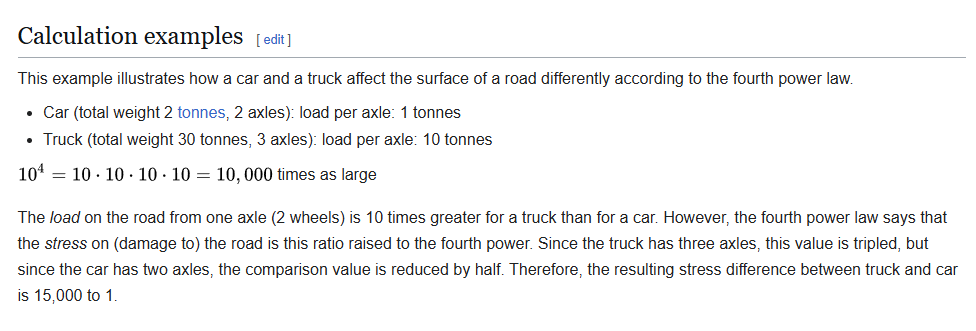 Biker16 Posted March 20 Author Share Posted March 20 5 hours ago, DeluxeStang said: A vehicle tax that goes towards road maintenance should be proportional to vehicle weight more than anything. Heavier vehicles are the ones causing more damage to the road. So it really shouldn't be a powertrain tax, but a weight tax. Some EVs are super heavy, some aren't, same with every other vehicle. If you're scooting around in a vehicle that weighs 3,500 lbs and isn't doing much damage to the road, your tax should be much lower than someone driving a 6,500 lb vehicle regardless of what kind of powertrain it has. Fourth power law - Wikipedia The Reality is that, although measurable, the Actual wear on the roads due to weight isn't as great as people think it is. The difference in your example is ~16 to 1 or 16x the wear of the 3500lbs vehicle. This is insignificant when compared to the Wear caused by medium and large trucks. Which are over 10,000 times that of a 4,000 lbs vehicle 1 Quote Link to comment Share on other sites More sharing options...